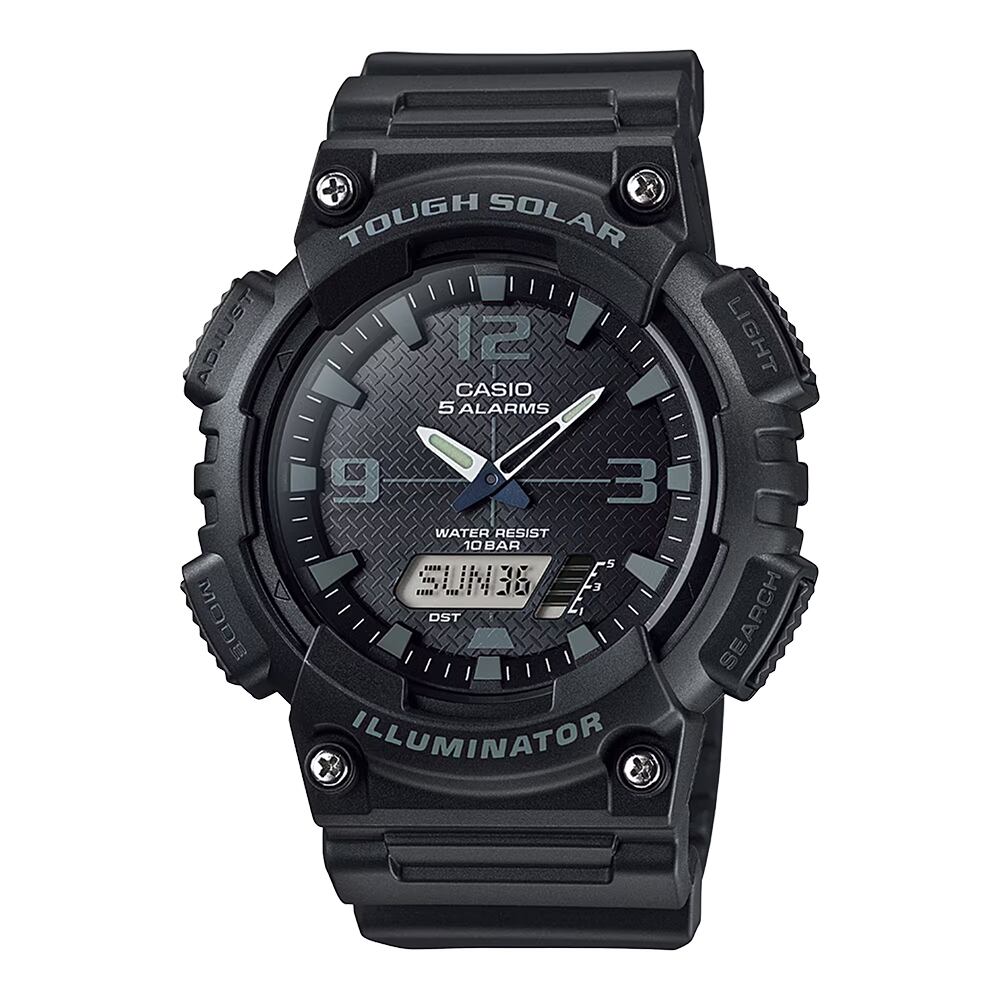 樹脂製のケースとブレスレットは、軽量で耐久性に優れ、あらゆるシーンでの使用に対応します。ブラックの文字盤は、シンプルでありながら視認性が高く、日付および曜日表示機能も搭載されているため、実用性にも配慮されています。