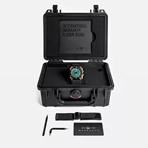 ブレス素材には、耐久性に優れたブラックラバーとヘビーデューティー仕様のシンセティックファブリックを使用しており、快適な装着感とスタイルを実現しています。また、ブラックとグリーンの色使いが施された文字盤は、視認性が高く、実用性も備えています。300m防水性を備えているため、さまざまな水中アクティビティにも安心して使用できます。